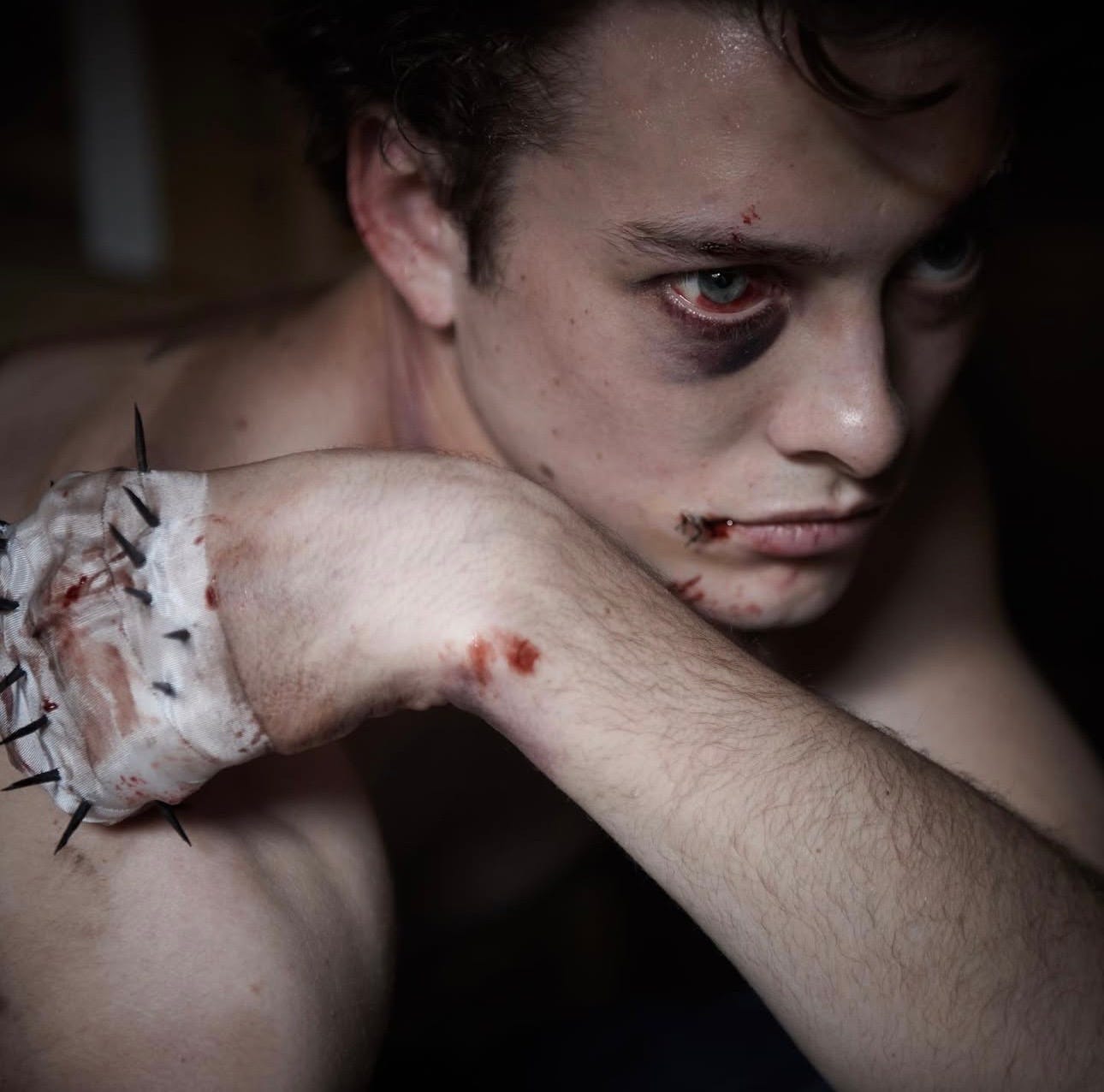 Then I do the makeup. I was never a makeup artist, but I thought it would be fun to learn how to do makeup. I read Fangoria as a kid. I was a monster fan. I started out doing horns, and prosthetics, and black eyes, and scrapes, and bruises. Then sometimes it looks like weird lesions and glitter rashes. There’s a bunch of different storylines that I have in my head, and I like to see what storyline this guy’s character fits into.
