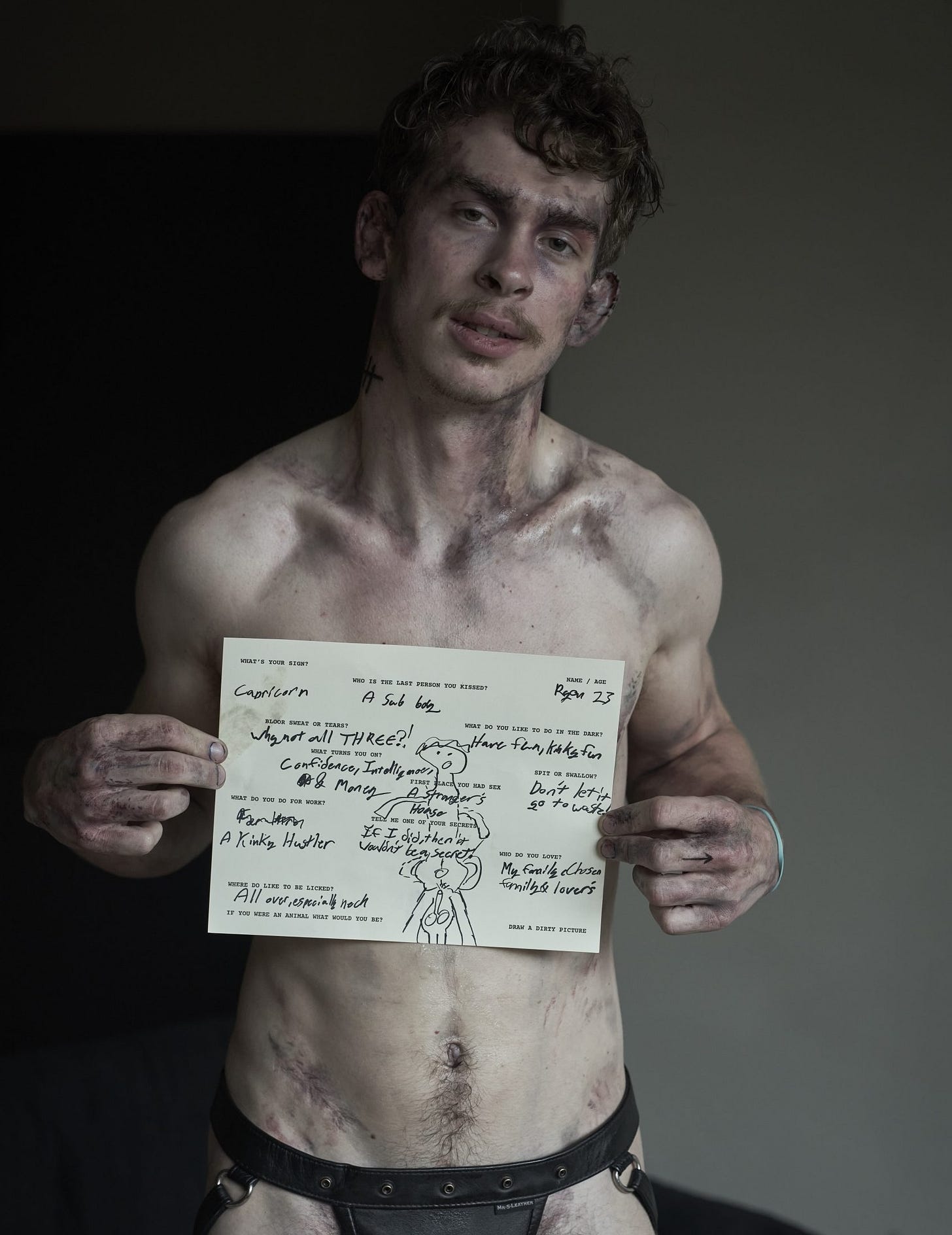I have hundreds, so I’m working on a little zine type thing with them. It started from Physique Pictorial and the symbology of what you would do for the models. I liked the idea of them contributing something other than just their image. Sometimes, I ask them to draw pictures. I always get it at the end of the shoot and I’m like, “Whoever that was that was just puking up whatever over there and covered in grease, he’s the one filling out this questionnaire. Not the guy that walked in the door. Everything on this questionnaire can be a lie if you want. It can all be true. It’s completely up to you.” Then I walk away. I let them do their thing, and it’s fun to see what they come up with.